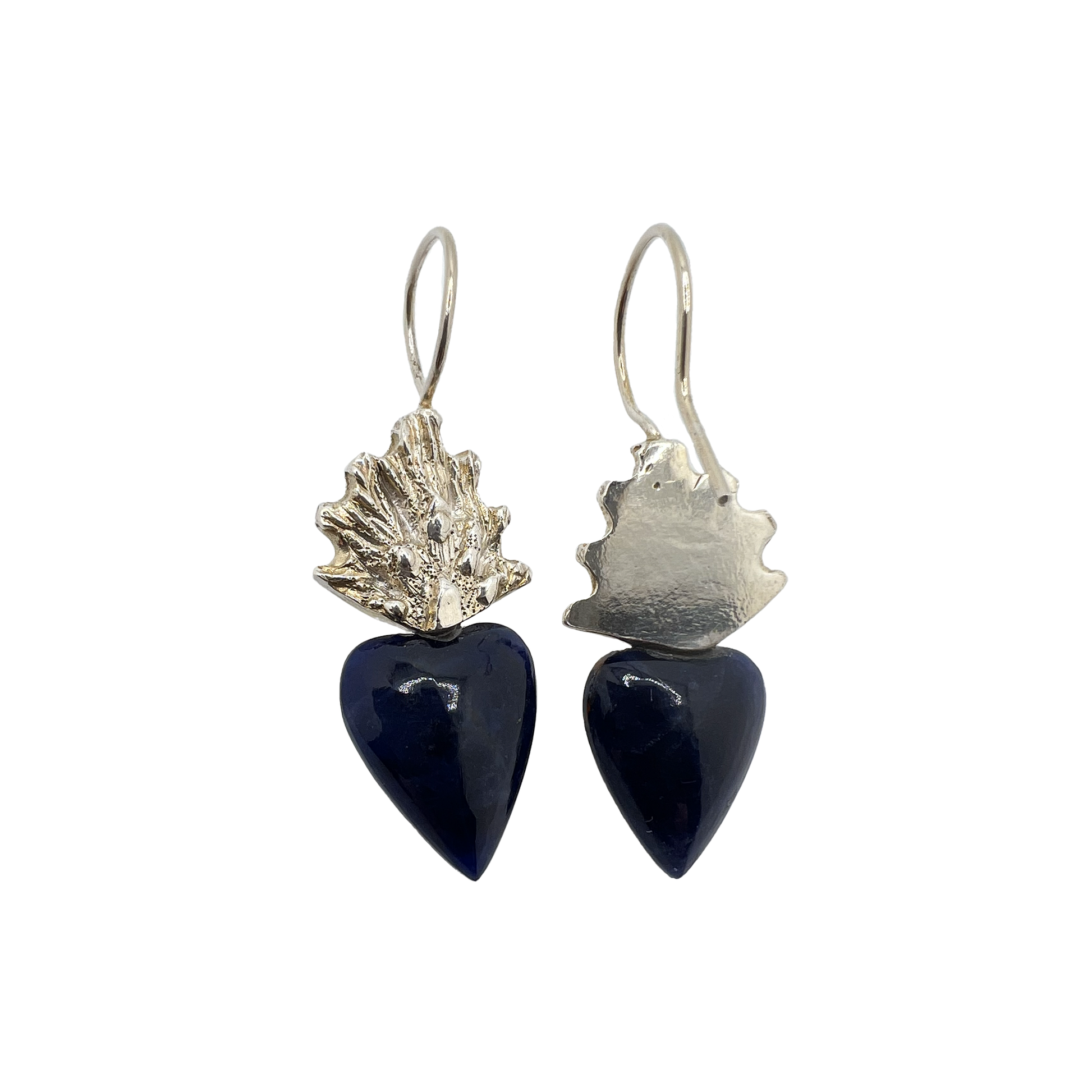 Blue Heart Silver earrings with a back ear hook, made of silver and with natural sodalite stone and silver flames.